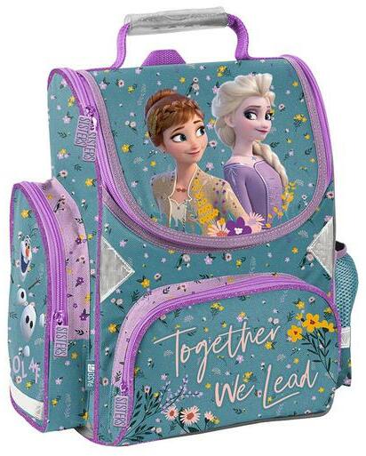 A Jégvarázs ergonomikus iskolatáska - Virágos a mesebeli lányok, Elsa és Anna képével, 1-2. osztályos kisiskolásoknak. Az ergonomikus megnevezés azt takarja, hogy a tervezés során figyelembe veszik a kisiskolás korú gyermekek testi adottságait és olyan hátizsákot készítenek, mely kíméli a gerincet, segíti a helyes testtartást. A könnyített (900g) táska oldala merevítet
