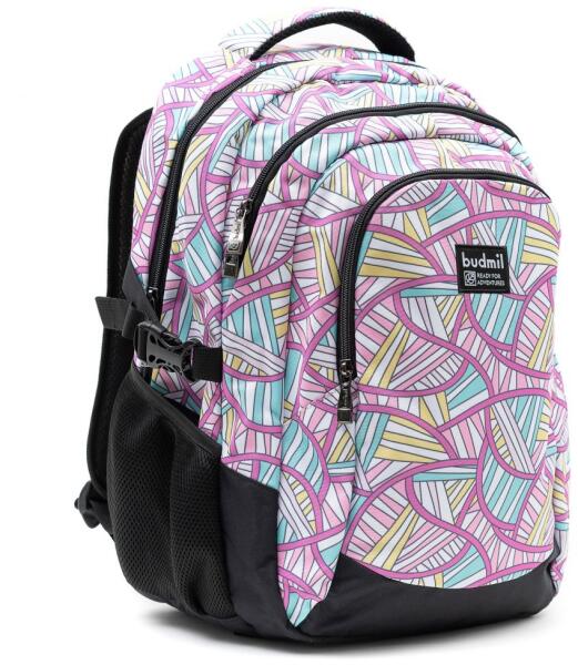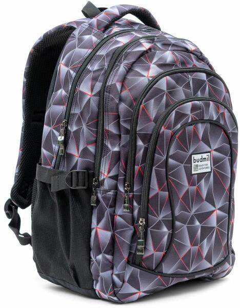Budmil Edwin hátitáska. Anyaga prémium poliészter. Ergonómikus, légcsatornás, párnázott hát kialakítás. Íves, párnázott, ergonómikus, állítható vállpántok. Erős, fix, párnázott kézbefogó a tetején. Mindkét oldalán hálós kulacstartó és bőséget szabályozó heveder. Elején kettő cipzáras zseb. Tetején tágas cipzáras fő rekesz, cipzáras irattartó rekesszel.