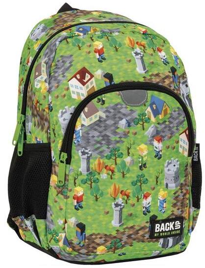 A BackUp hátizsák mellpánttal - 1 rekeszes - Game pixel vagány, videojáték ihlette mintákkal dekorálva a nagyobb korosztály ruhatárának kiegészítője. A hátizsák egy nagy rekesszel, egy kisebb méretű, cipzáras zsebbel és két kis hálós oldalzsebbel rendelkezik. A légáteresztő hálóval borított, szivacsos vállpánt állítható, a rajta lévő mellkaspánt tal pedig még