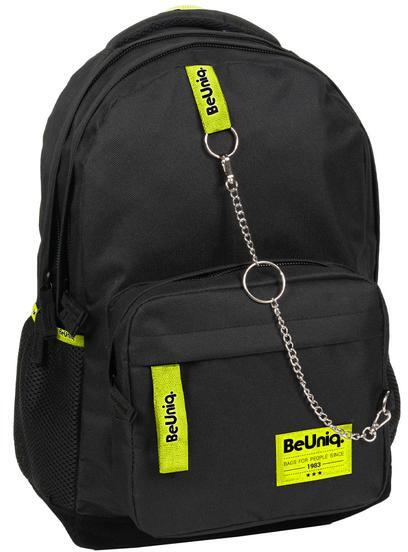 Nagyméretű BeUniq Casual hátizsák fekete színben, vagány láncos díszítéssel a nagyobb, felsős korosztály számára. A lányok és fiúk számára egyaránt ajánlott, elegáns hátizsák 2 nagy rekesszel, elején pedig 1 kisebb méretű cipzáras rekesszel és 1 cipzáras zsebbel rendelkezik. Hátoldala enyhén merevített, vállpántja állítható és párnázott. Oldalt hálós zseb