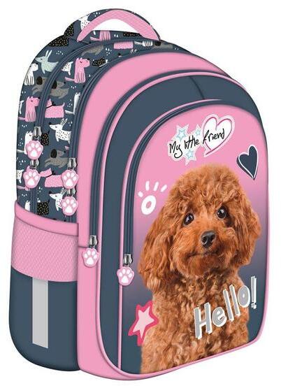 My little friend ergonomikus iskolatáska, hátizsák - 4 rekeszes - Hello dog (668371) , mely cuki kutyus mintával van ellátva, a kislányok kedvence lesz! Vízálló és tartós anyagból készült. A hátizsák nagyon tágas, 3 nagy rekesszel, illetve egy kisebb első rekesszel rendelkezik . Az első rekeszben praktikus rendszerező található egy kulcstartóval, amely segít a rend fenntart