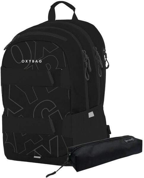 Iskolatáska szett: fekete iskolatáska és etue. Az OXY SPORT sorozat diák- és szabadidős iskolai hátizsákja ergonomikusan kialakított háttámlájával, állítható párnázott vállpántjaival és mellpántjával tűnik ki, amelyek kényelmes viseletet biztosítanak. A iskolai hátizsák két fő rekeszből és egy kisebb elülső zsebből áll, erős cipzárral és praktikus hurkokkal.