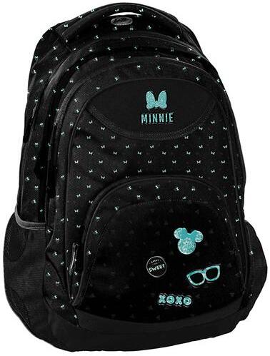 A BeUniq Minnie Mouse hátizsák, iskolatáska - 3 rekeszes - Xoxo fekete alapszínével és kék-fehér mintáival a nagyobb korosztály ruhatárának divatos kiegészítője. A hátizsák 3 különböző méretű cipzáras rekesszel, elöl plusz 1 kisebb cipzáras zsebbel és 2 hálós oldalzsebbel rendelkezik. A fő rekeszben található egy laptop tartó , a másik rekeszben egy rendszerező z