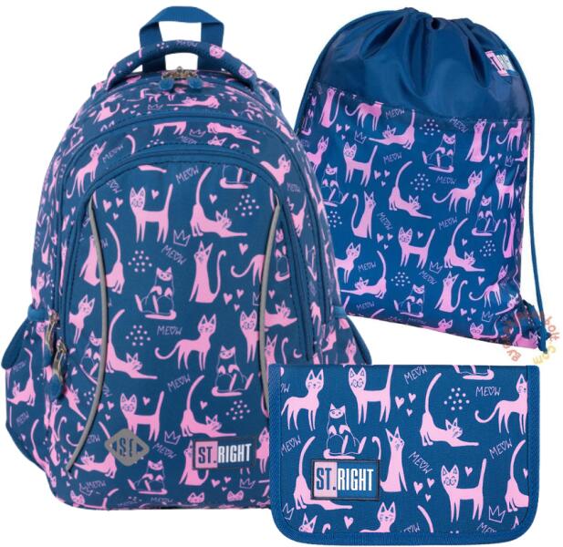 A te leánykád is rajong a cicákért? Akkor imádni fogja ezt a látványos cicás iskolatáska-szettet, melyen kék-lila hangulatban bukkannak fel, különleges fényhatásokkal a cicafigurák, melyek az iskolában is is hű társai lesznek gyermekednek. Az ergonomikus iskolatáskát kihajtható tolltartó és praktikus tornazsák egészíti ki. St. Right Lazy Cats ergonomikus iskolatáska Sok