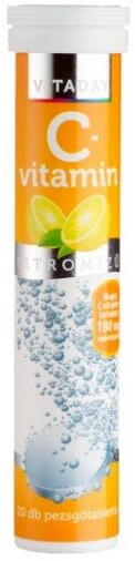 A C-vitamin hozzájárul az immunrendszer normál működéséhez. Étrend-kiegészítő pezsgőtabletta citrom ízben. 20 db-os pezsgőtabletta; 1x1 VitaDay termék az immunrendszer támogatásához.