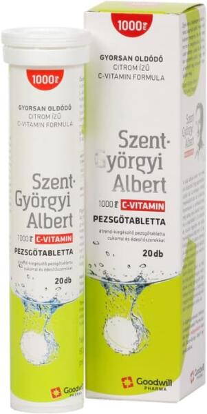SZENT-GYÖRGYI ALBERT 1000MG C-VITAMIN PEZSGŐTABLETTA CUKORRAL ÉS ÉDESÍTŐSZEREK 20DB Termék leírása: Amiko r a C-vitamin fogyasztás élvezetté válik!Gyorsan oldódó, finom citrom ízű C-vitamin formula!A pezsgőtabletta felezhető, így 500 mg C-vitamin pótlására is alkalmas. A C-vitamin hozzájárul a fáradtság, a kifáradás csökkentéséhez és a sejtek oxidatív stresszel sz