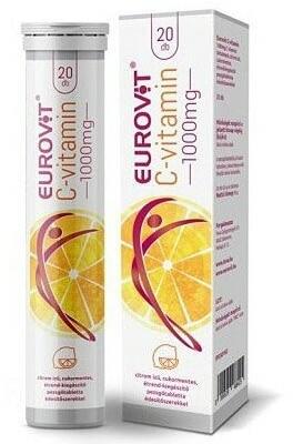 C-vitamint tartalmazó citrom ízű cukormentes étrend-kiegészítő pezsgőtabletta, édesítőszerrel. A C-vitamin elősegíti az egészséges fogazat és csontok kialakulását valamint antioxidáns hatásával hozzájárul a szervezetünk védekező rendszerének normális működéséhez. Az Eurovit C-vitamin 1000 mg pezsgőtablettának kellemes citromos íze van. 2 dl hideg vízben javasolt