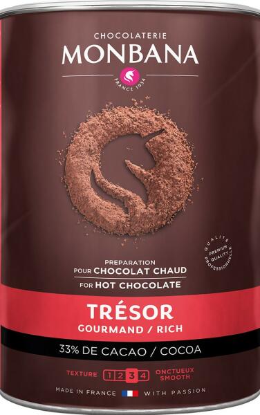 Monbana forró csokoládé Tresor 1kg Finom Monbana tejcsokoládé tejben Forró csokoládé készítésére alkalmas. A 33%-os kakaó garantálja a tökéletes ízélményt. Javasolt adagolás: Keverjen el egy evőkanál port (25 g) 200 ml forró tejben. Hozzávalók: Cukor, kakaópor (min. 33%). Búzakeményítő , sűrítőanyag: xantángumi. Vanília aroma. Az allergének félkövérrel vannak