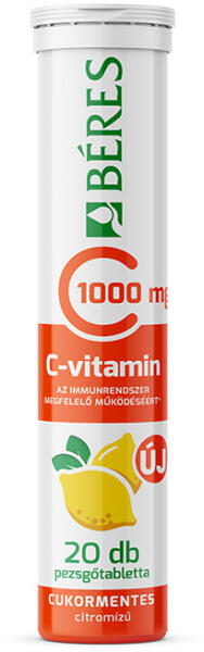 Béres C-vitamin 1000 mg cukormentes citromízű pezsgőtabletta étrend-kiegészítő készítmény édesítőszerekkel. Béres C-vitamin 1000 mg cukormentes citromízű pezsgőtabletta étrend-kiegészítő készítmény édesítőszerekkel. Magas hatóanyag-tartalom: cukormentes pezsgőtabletta 1000 mg C-vitaminnal. Új, magas hatóanyag-tartalmú, cukormentes Béres C-vitamin 1000 mg pezsgőta