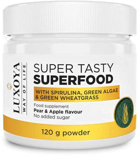 Luxoya Super Tasty Superfood - körte-alma ízesítésű spirulinát, zöld algát és zöld búzafüvet tartalmazó étrend-kiegészítő italpor 120 g. A SUPER TASTY SUPERFOOD with SPIRULINA, GREEN ALGAE & GREEN WHEATGRASS termékünk egyedi módon kombinálja a spirulinát a legkiválóbb szuperélelmiszerekkel, mint az almarost, zöld alga, búzafű, árpafű, Reishi gomba, petrezselyem, s