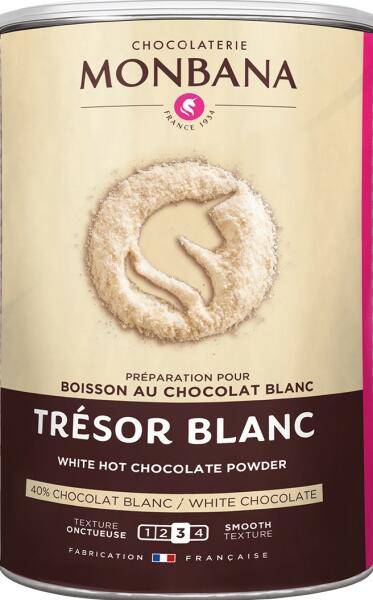 Monbana fehér csokoládé Tresor 500g Instant keverék forró ital készítéséhez fehér csokoládéval Forró tejbe keverhető. A sűrű állag érdekében a csokoládét célszerű gőzfúvókán vagy a tűzhelyen folyamatos keverés mellett felmelegíteni. Egy finom vanília és 40%-os kakaótartalom garantálja a tökéletes élvezetet. Hozzávalók: Cukor, kakaóvaj, teljes tejpor . Fölö