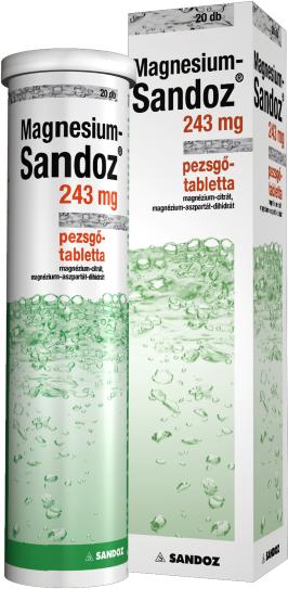 Hatóanyag: magnézium-citrát, magnézium-aszpartát-dihidrát. A magnézium szerepet játszik az idegrendszer normál működésében, szükséges a normál izomműködés fenntartásához. Víztiszta oldódású, citromízű pezsgőtabletta a Sandoztól.