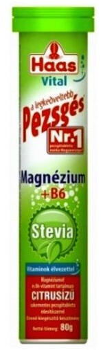 Magnéziumot és B6-vitamint tartalmazó citrus ízű pezsgőtabletta édesítőszerrel. 20 db-os pezsgőtabletta; Haas termék az ideg- és a csontrendszer egészségéért.