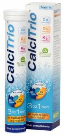 A CalciTrio pezsgőtabletta kalciumot, K2-vitamint és D3-vitamint tartalmazó narancsízű étrend-kiegészítő pezsgőtabletta édesítőszerekkel. Kalcium - az erős és egészséges csontokért K2 vitamin – a kalcium csontokba való beépüléshez D3 vitamin – a kalcium hatékony felszívódásához Tudta Ön, hogy a régi csontszövet lebomlik és új képződik helyette? Életünk korai