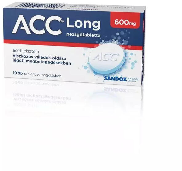 Az ACC long 600 mg pezsgőtabletta, aminek hatóanyaga az acetilcisztein, a légutakban levő sűrű viszkózus váladék oldására alkalmas. Fokozott viszkozitású nyák termelődésével, hurutos köhögéssel járó légúti betegségek váladékoldást elősegítő terápiájában javallt. Az ACC long 600 mg pezsgőtabletta, aminek hatóanyaga az acetilcisztein, a légutakban levő sűrű vi