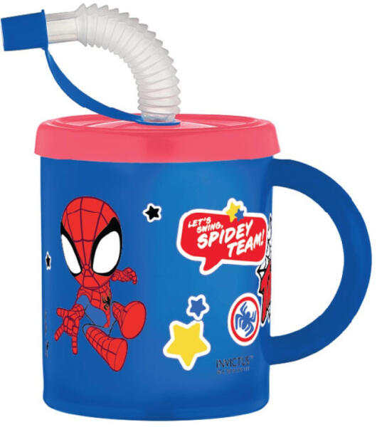 Spiderman, Pókember Spidey szívószálas bögre, műanyag 210 ml Zárható tetővel. Nem mikrózható. Mosogatógépben nem használható. -BPA Mentes -Származási ország: Spanyolország Anyaga: műanyag Űrtartalom: 210 ml