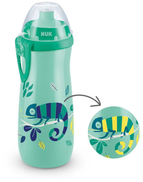 NUK SPORTS CUP Chameleon kulacs 450 ml űrtartalommal. Tulajdonságok: Átlátszó védőfedél. Ellenálló és könnyű anyag, BPA mentes. Kamélon effekt a nagyobb ivási élményért. A szín változása a felület felmelegedése vagy lehűlése hatására. Szilikon push-pull itatócsőr – mosogatógépben mosható. Praktikus klipsz a könnyű rögzítéshez. 24 hónapos kortól ajánlott gy