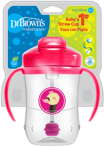 DR. BROWNS - Bögre szívószállal 270ml fogantyúval rózsaszín (TC91101-INTL), A bögre puha szilikon szívószállal lehetővé teszi a könnyű átmenetet a palackból való ivásról a bögréből való ivásra.