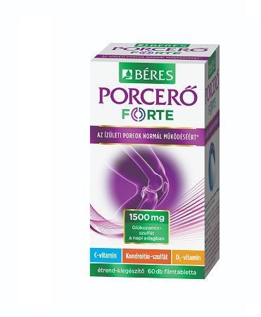 Béres Porcerő Forte filmtabletta komplex étrend-kiegészítő készítmény glükozamin-szulfáttal, kondroitin-szulfáttal, valamint C- és D3-vitaminnal. Jellemzők1500 mg glükozamin-szulfát biztosítása a napi adagban. Komplex összetétel: C-vitaminnal, D3-vitaminnal, glükozamin-szulfát, kondroitin-szulfáttal. A porc egy nagy teherbírású, rugalmas szövet, melyre a mindennapjainkba