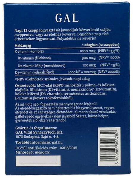 K2-D3 vitamin, 1000 mcg K-komplex + 4000 NE D3-vitamin. 20 ml-es csepp; GAL termék a csontok és fogak egészségéért.