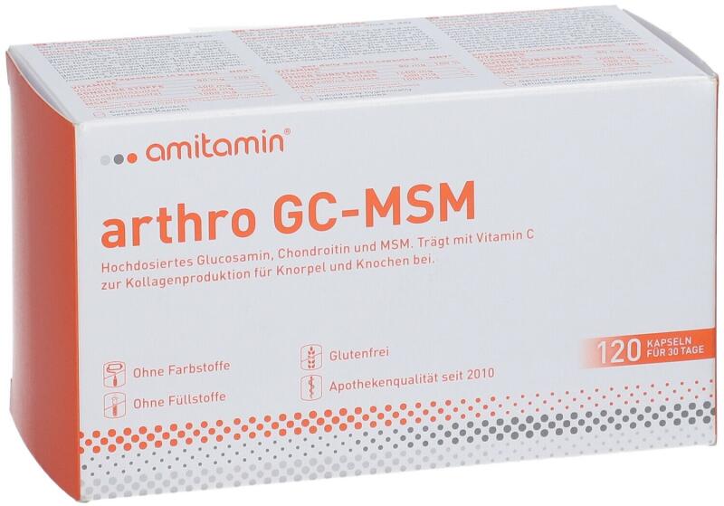 Az Amitamin arthro GC-MSM 400 mg kondoitin-szulfátot tartalmaz napi adagban. A GLUCOSAMIN egy aminosavcukor, amely természetes módon fordul elő az emberi szervezetben. A porcok szerkezetének felépítéséhez szükséges. Az Amitamin arthro GC-MSM napi adagonként 1400 mg glükozamin-szulfátot tartalmaz. Az MSM (metilszulfonil-metán) egy szerves kén. A szervezetnek sok kénre van szükség
