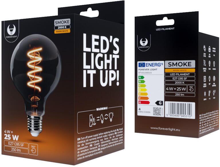 Specifikáció - Márka: Forever Light - Energiaosztály: G - Melegítési idő: 1 s - Sötétítő: nem - Teljesítmény tényező (PF): > 0,4 - Menet típusa: E27 - Világítási szög: 300° - A lumenek száma: 250 lm - A hagyományos izzóval egyenértékű: 25 W - Életerő: 15 000 óra - Színhőmérséklet: 2 000 K - CRI (Ra) együttható: > 80 - Üzemi hőmérséklet: -20°C és +45