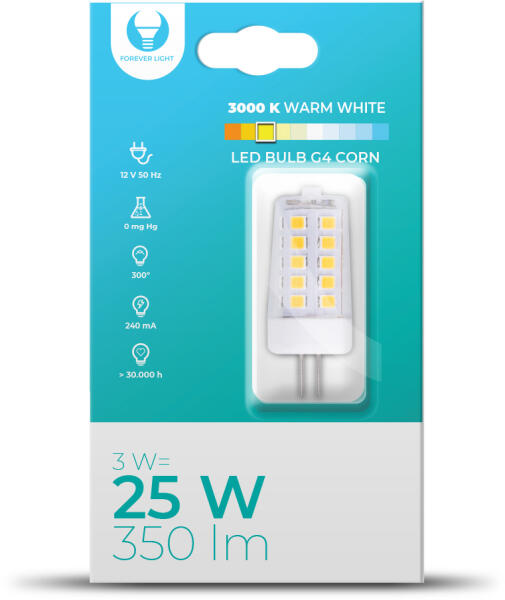 Specifikáció - Márka: Forever Light - Energiaosztály: F - Áramerősség: 240 mA - Dióda típusa: 2835 - Világítási szög: 300° - A lumenek száma: 350 lm - A hagyományos izzóval egyenértékű: 25 W - Életerő: 30 000 óra - Színhőmérséklet: 3 000 K - Üzemi hőmérséklet: -20°C és +45°C között - Melegítési idő: 1 s - Be-/kikapcsolások száma: > 15 000 - Sötétítő:
