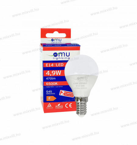 OMU Lighting LED izzó E14 G45 4,9W 470lm 6500K hideg fehér garancia 2 év LBE14G454.94706500 Technikai paraméterek: Foglalat: E14 Teljesítmény: 4,9W Fényerő megfelel: 40W normál izzó Színhőmérséklet: 6500K hideg fehér Fényerő: 470lm LED chip: SMD2835 Sugárzási szög: 120° Élettartam: 15.000 h Fényerőszabályzás: nem DF 0,5 Teljesítmény tényező : Pf >0.5 Szín visszaad