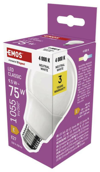 Tulajdonságok: Értékesítési csomagolás: 1 db, kis doboz Méretek: 60 × 60 × 109 mm Feszültség: 230 V~/50 Hz Fényáram: 1 055 lm Garancia-időszak: 3 év Fény színe: természetes fehér Sugárzási szög: 180° Fogyasztás: 9,5 W Chipek típusa: SMD Dimmelhető: nem Élettartam: 30 000 óra Energiaosztály: E Fényhasznosítás: 111 lm/W Foglalat: E27 Forma: A60 Helyettesítő: 75 W Ka