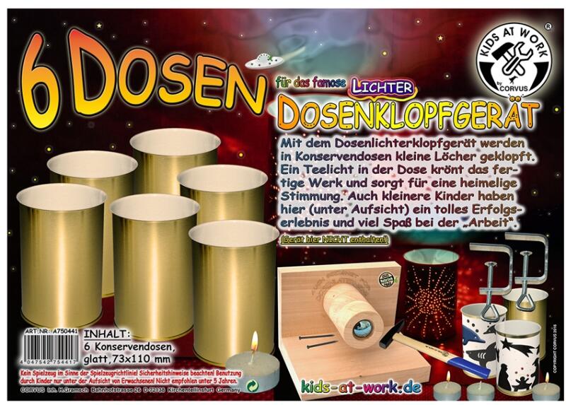 A lámpás készítő szett tartalma: 2 db fa henger, nagyító, 1 db kalapács, 3 db konzervdoboz, szögek és csavarok a lyukasztáshoz, díszítő mintasablonok, 3 db mécses. Méret: konzervdobozok 7,3 cm x 11 cm Életkor: 5+ Lámpás szett, szerelős játékook iránt érdeklődő gyerekeknek.