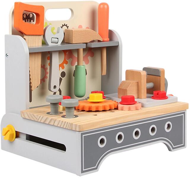 M-Toys Fa munkapad Az M-Toys 2 in 1 munkapad fa kiegészítőkkel szórakoztató és örömteli pillanatokkal biztosít gyermekének, valamint átalakítható asztallá; A készlet különböző munkadarabokat tartalmaz, amelyek egy munkapadra jellemzőek, beleértve azokat a darabokat, amelyek objektumokat hoznak létre, és ezáltal támogatják a kicsi képzeletének fejlődését; A tárolót