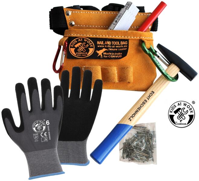 A szett tartalma: bőr szerszámtartó és öv, 1 db colstok, 1 db kalapács, 1 db karabíner és 1 csomag szög, 1 db ács ceruza és 2 db kesztyű. Gyerekekre mértetezve! Játék szerszám szerelős játékokhoz.