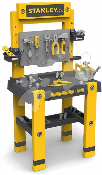 Stanley Bricolo One Workbench szerelőműhely a francia Smoby gyártótól gyerekeknek 3 éves kortól. A pompás játék számos funkciót és munkaeszközt kínál, amelyek órákra lekötik a kis barkácsokat. A 57 kiegészítőből álló gazdag készlet fogót, csavarhúzót, fűrészt, kalapácsot, szerelő kulcsot, satut, csavarokat, anyákat, szögeket, kalapácsoló játékot és vonalzó