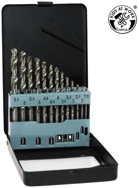 Fémfúró készlet, fém dobozban. A 600058 as termékhez használható. A legvékonyabb fúrószár 1,5 mm átmérőjű, a legvastagabb fúrószár 6,5 mm átmérőjű. Életkor: 6+ Alapanyaga: fém Játék szerszám szerelős játékokhoz.