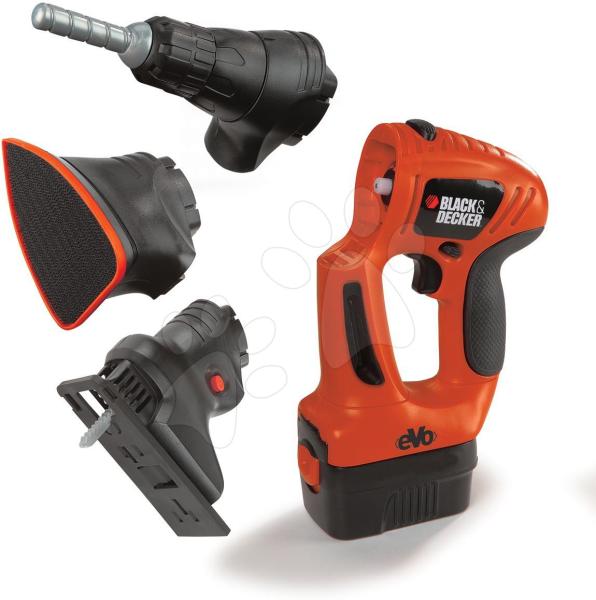 Smoby elektronikus szerszám Black&Decker Quatro szett egy kidolgozott és praktikus játék. Ideális kisfiúnak , aki szeret barkácsolni és szerszámokkal dolgozni. Ez a szerszám 3 kiegészítőt tartalmaz, melyek igazi többfunkciós eszközzé változtatják és a kisgyerekből valódi ezermester válik. Egyik pillanatban fúrógép , majd csiszoló és végül kézifűrész . Mindez eg