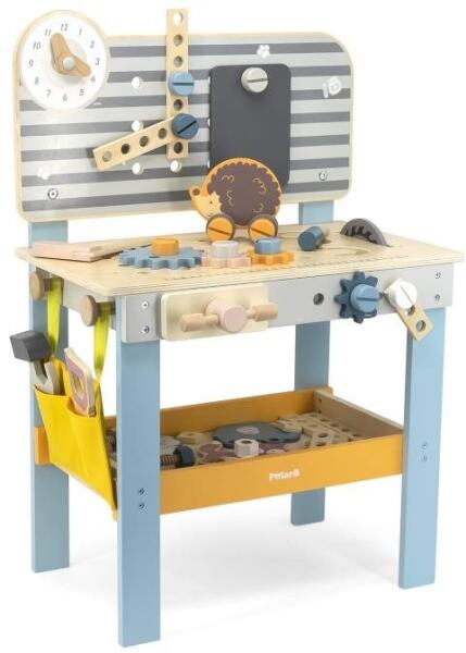 Small foot 11375 Munkapad satuval barkácsolós játékokhoz óvodás kisfiúknak skandináv stílusban. Lágy színek, letisztult formák, természetes anyagok – ez az északi design! Ezzel a masszív, fából készült munkapaddal a fiúk és a lányok játékosan sajátítják el az első barkácsolós tevékenységeiket. Az 5 különböző szerszám és a 24 darabból álló kiegészítők f