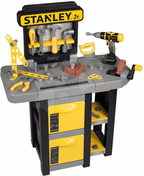 Munkapad Open Bricolo a francia Smoby gyártótól. A szerelőműhely gyerekeknek 3 éves kortól ajánlott és tökéletes ajándéknak minősül a ki barkácsolók számára. A modern Stanley munkapad sárga-fekete színben pár perc alatt összecsukható és áthelyezhető. A gazdag felszerelést 37 kiegészítő, többek között mechanikus fúrógép cserélhető fejekkel, csavarhúzó, kalap