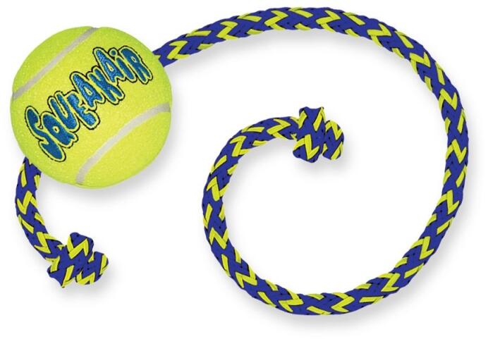 SqueakAir Balls with Rope Játéklabda kutyáknak teniszlabda kivitelben, dobókötéllel és integrált sípolóval. Ideális apportírozáshoz, levadászáshoz. Nagyon fogbarát anyagból, natúr gumiból és poliészterből. A KONG SqueakAir Ball kötéllel kutyajáték teniszlabda és sípolós játék kombinációja, ami tökéletes eszköznek bizonyul apportírozáskor és gondoskodik az int