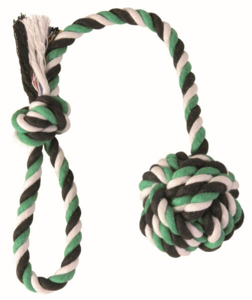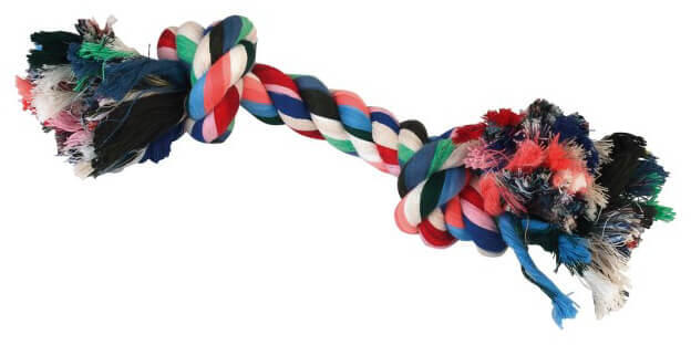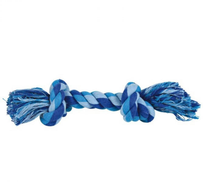 Pamutkeverékből készüt színes rágókötél csomókkal kutyáknak. A fogtisztító hatása révén ápolja a fogakat és fogközöket játék közben. Mérete: 26 cm