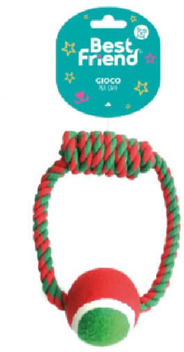 Pamut gyűrű teniszlabdával kutyáknak. Tökéletes játék a kutyával való kötélhúzáshoz és sok más mozgásos tevékenységhez. Piros, zöld és fehér: a stílus a karácsonyra emlékeztet.
