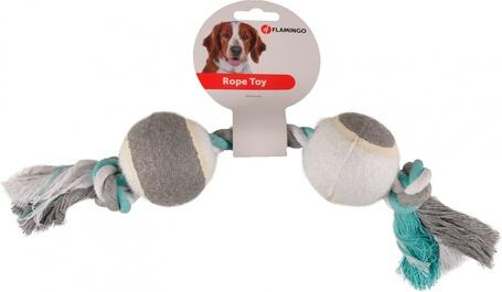 Flamingo kötél játék kutyáknak két teniszlabdával. Apportírozáshoz, rágcsáláshoz, huza-vona játékhoz is kiválóan alkalmas. A kötél rész pamutból készült. Több színben kapható.