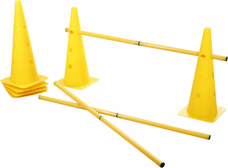 2-az-1-ben - akadály és szlalompálya egyben állítható magasság 6 bólyával (21 x 21 x 46 cm) és 3 műanyag karóval (hossz: 1m) akadály magasságban állítható (11 cm, 21 cm vagy 31 cm) műanyag karók összahajthatók, így helytakarékos