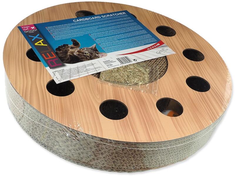Újrahasznosított hullámkartonból készült interaktív kaparó macskagyökérrel és 2 golyó csengővel macskák számára. kör alakú kaparó lyukakkal és 2 golyóval a kaparóhoz egy tasak is jár macskagyökérrel, ami felkelti a macska érdeklődését és nyugtató hatást gyakorol a növény megkóstolása után egyedi kialakítású vonzó felület kaparáshoz és játékhoz, mely le