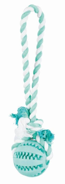 Trixie fogtisztító labda kötéllel A menta ízesítésű természetes gumilabda hatásosan masszírozza az ínyt és tisztítja a fogakat, fogközöket az apró redőknek köszönhetően. A labdára csomózott kötéllel könnyen elhajíthatja, vagy kötélhúzáshoz is használhatja. Tökéletes választás az erő összeméréséhez és a játékra ösztönzéshez. Kedvence különösen élve