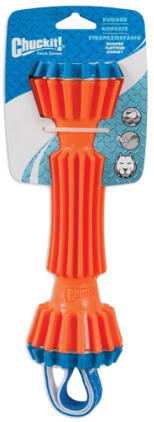 Masszív gumiból készült játék, mely úszik a vízen! Kiifejezetten apportírozásra tervezték. Durva kialakításának köszönhetően kutyája könnyen meg tudja fogni és felvenni, a tartós gumi (TPR) pedig még a vízen is lebeg , így igazi vizi játék is egyben. A Chuckit Rugged Bumper két nylon kötele extra szórakozást biztosít és a zsákmányösztönt is stimulálja. Mérete: