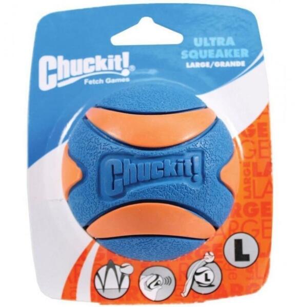 A Chuckit Ultra Squeaker Ball gumilabda könnyű nem tömör és nagyszerűen pattogChuckit Ultra Squeaker Balla klasszikus Chuckit labda Ultra ball sípoló csipogó testvére Ugyanolyan strapabíró és extraerős mégis fogkímélő EVA gumiból készült A belsejébe viszont egy csipogó van elrejtve mely összenyomásraharapásra lép működésbe Ez a hangeffekt még élvezetesebbé teszi a