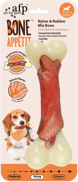Az AFP Bone Appetit - Crunch Rubber Bone nemcsak élethűen néz ki, hanem szalonna íze is van, és rágás közben recsegő hangot ad ki! A csont tartós gumiból készült, színeinek és formájának köszönhetően nagyon élethűen néz ki. A szalonna finom illata és íze azt jelenti, hogy kutyája ízletes csontot élvezhet anélkül, hogy aggódnia kellene a kellemetlen szag miatt. Sőt,