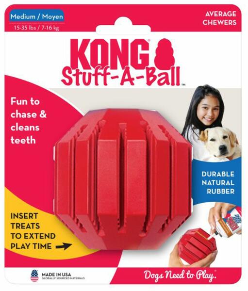 A Kong Stuff-A-Ball egy tartós labda strukturált bordával és hellyel középen a kutyacsemege töltéséhez. hosszan tartó szórakozást és elfoglaltságot biztosít a kutyának kielégíti a kutya ösztönös szükségleteit a játék kutyacsemegékkel vagy Kong habbal való megtöltése, valamint maga a rugalmas anyag hozzájárul a játék iránti hosszabb érdeklődéshez Mérete : M, 7,