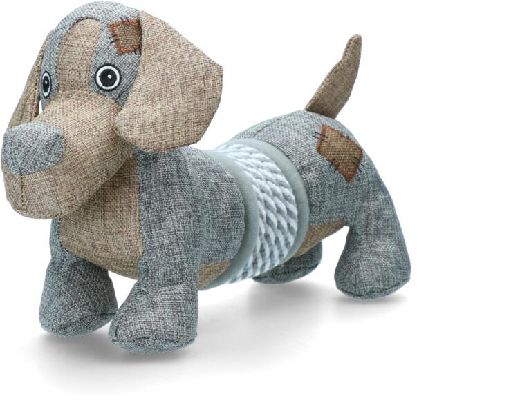 Masszív tömött játék kutyáknak, strapabíró és erős vászonból készült dupla varással újrahasznosított műanyagból középen rugós kötéllel, sípoló hangot ad az extra szórakozás érdekében. Mérete: 35x18 cm