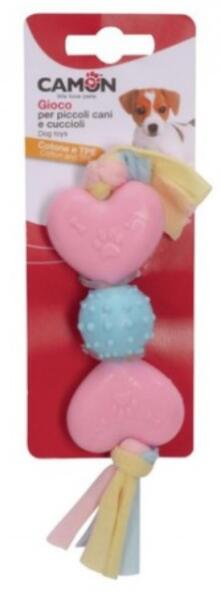TPE-ből készült játék, melyen labda, karika és szívecske található. A játék mindkét végén pamut fonat van, mely gondoskodik a puhaságról. A játék kellemes pasztell színekből áll. Mérete: 20 cm